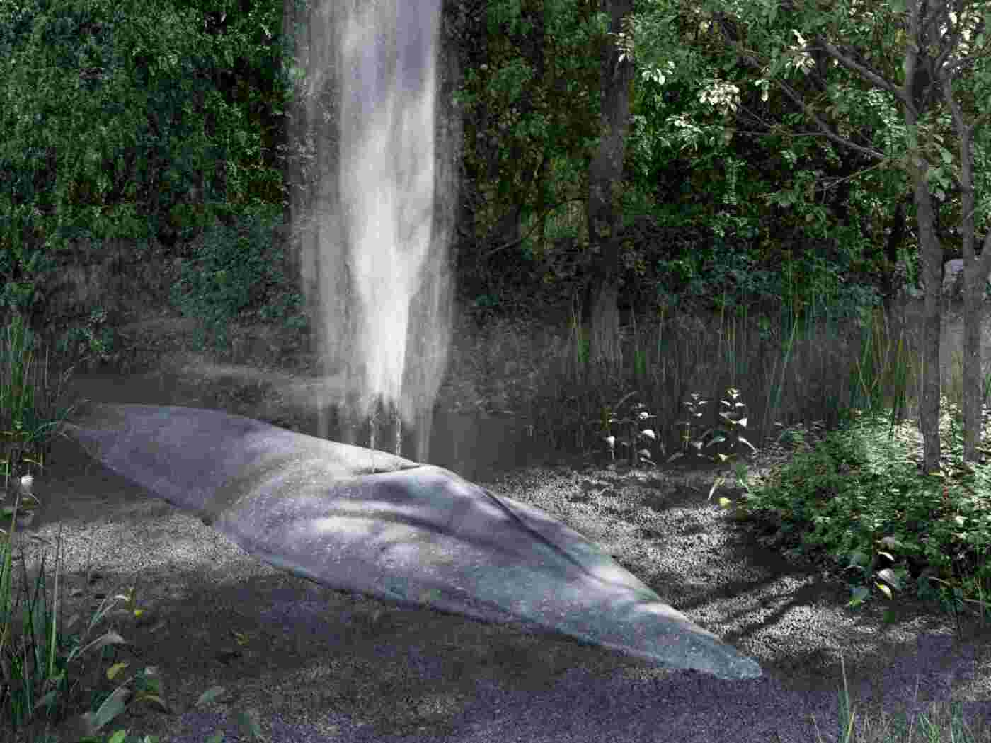 «Une bosse discrète mais puissante, comme si le mammifère marin remontait à la surface pour respirer», relève l’artiste née à Genève en 1978 et qui réside à Zurich, citée dans le communiqué. «Au sommet de cette forme oblongue, deux narines laissent jaillir, à intervalles réguliers, un nuage brumeux composé d’eau vaporisée.»