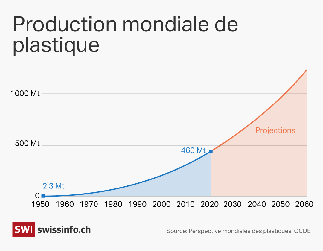 Chaque année, plus de 400 millions de tonnes de plastiqueLien externe sont produites, dont la moitié pour un usage unique. Moins de 10% de ces déchets sont recyclés. Le reste s’accumule dans les décharges, les sols, les mers ou se décompose en microplastiques qui contaminent les écosystèmes et s’infiltrent jusque dans le sang humain. La production mondiale de plastiques a doublé en vingt ans et pourrait tripler d’ici 2060, selon l’OCDELien externe, alimentant un tsunami de pollution dont les conséquences sanitaires et environnementales sont encore largement méconnues.