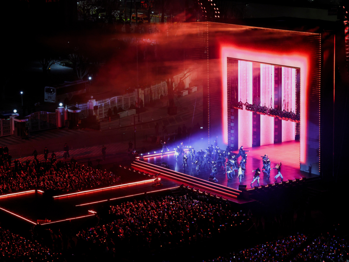 La porte de Gwanghwamun était illuminée aux couleurs de l’arc-en-ciel, tandis qu’une immense installation scénique comportant trois éléments circulaires – symbolisant le nouvel album de BTS – brillait sous d’imposantes structures d’éclairage.