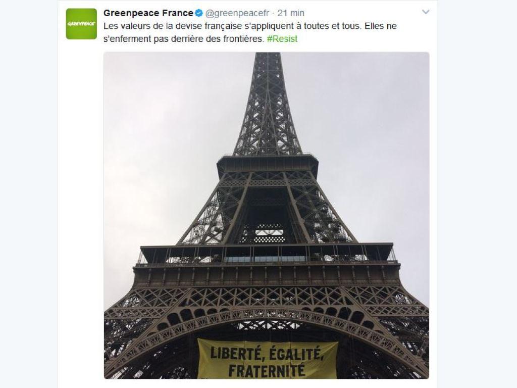 Selon l’organisation, douze militants sont parvenus, peu après 7h30, à fixer cette banderole de 30 mètres sur 10 entre deux piliers de la tour, sous le premier étage de la tour. Outre la devise de la République, la banderole porte le nom de l’organisation environnementale et la mention #resist, en lettres noires sur fond jaune.