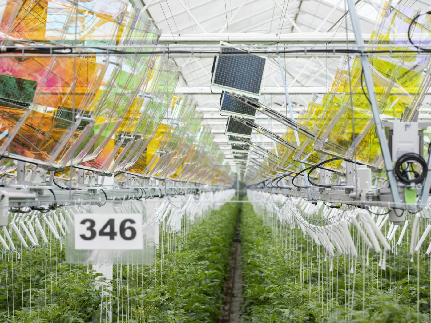 Cet équipement utilise une technologie de filtrage de la lumière. Pour leur photosynthèse, les plantes à tomates n’ont besoin que des ondes lumineuses rouges et bleues. Elles ne nécessitent aucune lumière verte ou infrarouge pour pousser. Les ondes lumineuses inutiles aux tomates sont donc exfiltrées et regroupées pour être projetées par les filtres concaves avec une intensité quadruplée sur les panneaux solaires suspendus au plafond.