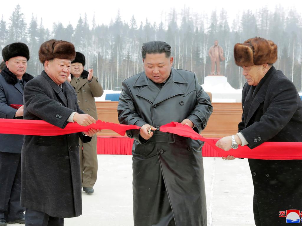 KCNA a diffusé une photo de M. Kim en imperméable de cuir noir coupant un ruban rouge au milieu de responsables coiffés de chapeaux de fourrure, lors d’une cérémonie d’inauguration près d’une statue de son père Kim Jong-il.