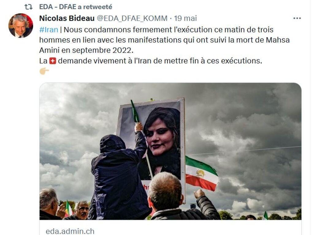 Dans son tweet, la Suisse "condamne fermement" l'exécution de trois hommes en Iran. Compte Twitter du DFAE sda-ats