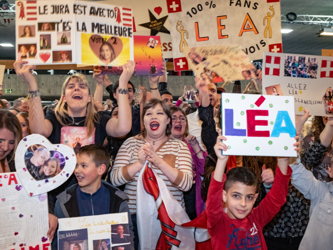(Keystone-ATS) Avant le coup d’envoi du duplex avec le studio à Paris, le public de tous les âges manifestait déjà son soutien à la candidate biennoise en brandissant des pancartes avec des inscriptions comme «100% fan de Lea» ou «Lea notre Suissesse». Des jeunes filles arboraient aussi des t-shirts à l’effigie de leur idole et les fans scandaient «Léa, Léa».