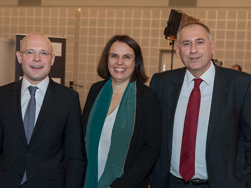 Les trois élus du jour ont le sourire: Baschi Dürr (PLR), la Verte Elisabeth Ackermann (à la présidence) et Hans-Peter Wessels (PS). KEYSTONE/GEORGIOS KEFALAS sda-ats