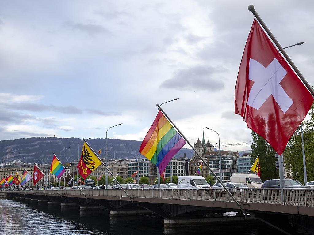 La Geneva Pride aura lieu du 8 au 12 septembre. Le point d'orgue de la manifestation sera la Marche des fiertés du 11 septembre. Pour l'occasion, le pont du Mont-Blanc sera pavoisé des couleurs LGBTIQ+ (archives). KEYSTONE/SALVATORE DI NOLFI sda-ats