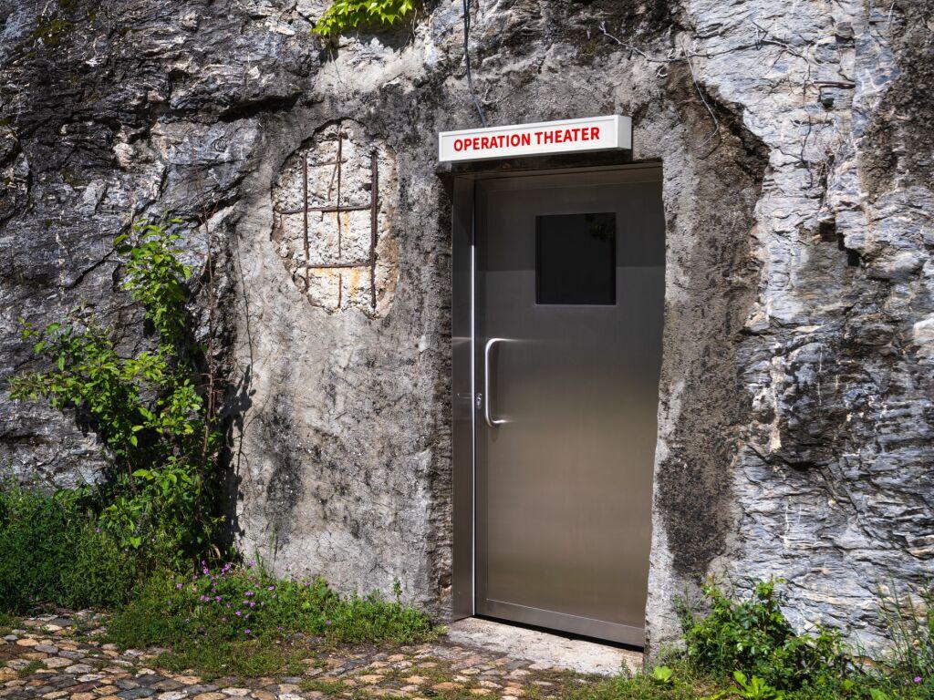 L’exposition commence devant le Musée d’art du Valais, sur la place de la Majorie. Une enseigne lumineuse, qui porte le mot «Operation Theater» («salle d’opération» en anglais), écrit en lettres rouges sur fond blanc, surmonte une porte creusée dans la colline qui abritait autrefois un hôpital militaire. La porte est fermée et, du hublot on aperçoit un rideau de scène tiré.