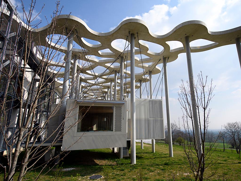 Conçue par des architectes différents, les sept maisonnettes suspendues à la canopée de béton complètent depuis peu le bâtiment imposant de la Fondation Jan Michalski pour l’écriture et la littérature. En 2017, 29 auteurs au total y trouveront le gîte et le couvert, pour des durées de deux semaines à six mois.