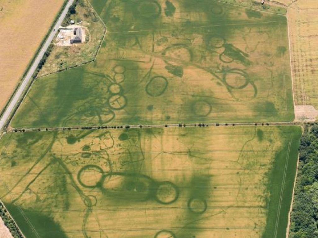 Les photos aériennes d’Historic England montrent ainsi des prairies à l’herbe jaunie par la chaleur, avec des segments et des cercles plus clairs ou plus foncés, révélant la position de constructions et de tranchées.