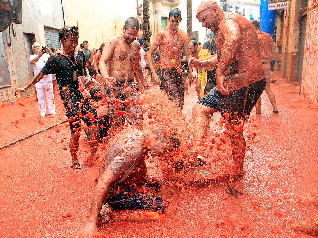 Pendant une heure, les participants, pour la plupart vêtus d’un simple maillot de bain et de lunettes de natation, se sont envoyé des tomates à la figure, se vautrant dans une épaisse couche de pulpe rouge.