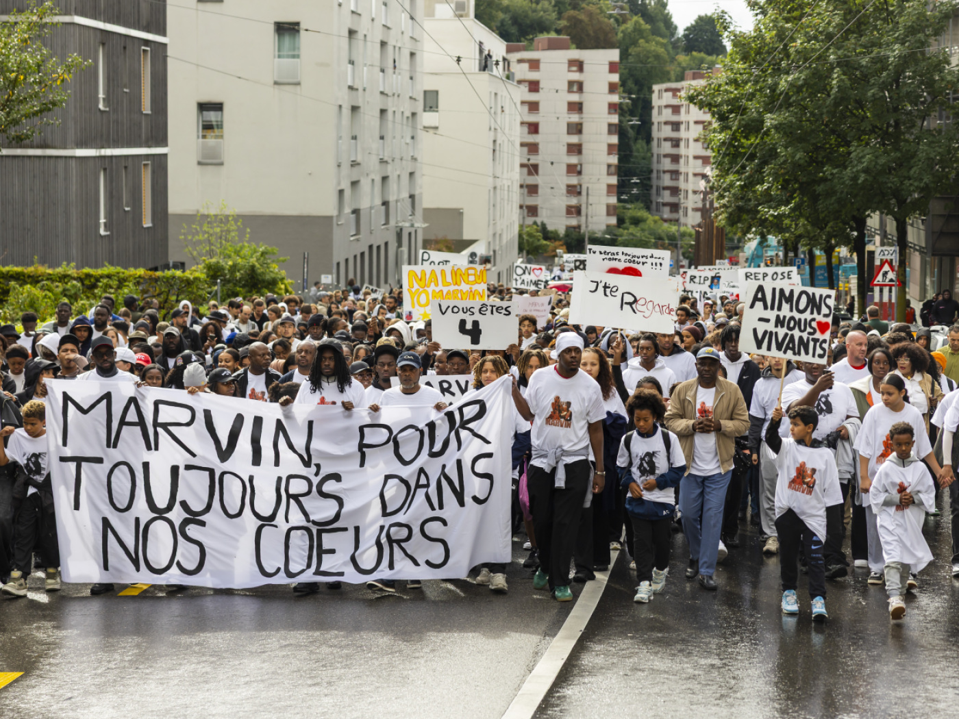 Vêtus de blanc, avec des T-shirt à l’effigie de Marvin, les participants se sont mis en marche en silence. Un très grand nombre d’adolescents composait le cortège. Certains portaient des pancartes proclamant «Justice pour Marvin», «Je t’aime petit frère» ou encore «Le temps n’effacera jamais ton sourire».