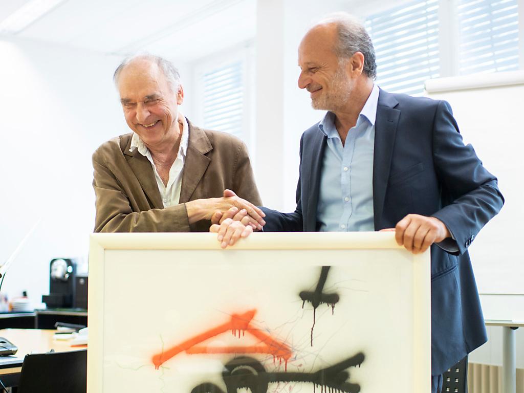 Face aux journalistes et aux photographes, Harald Naegeli, 78 ans, a transmis une oeuvre d’art au chef sortant du dicastère municipal des transports publics et de la voirie Filippo Leutenegger (PLR). «Nous avons eu des entretiens d’une grande intensité et sommes parvenus à cette solution créative», s’est réjoui le membre de l’exécutif de la ville.