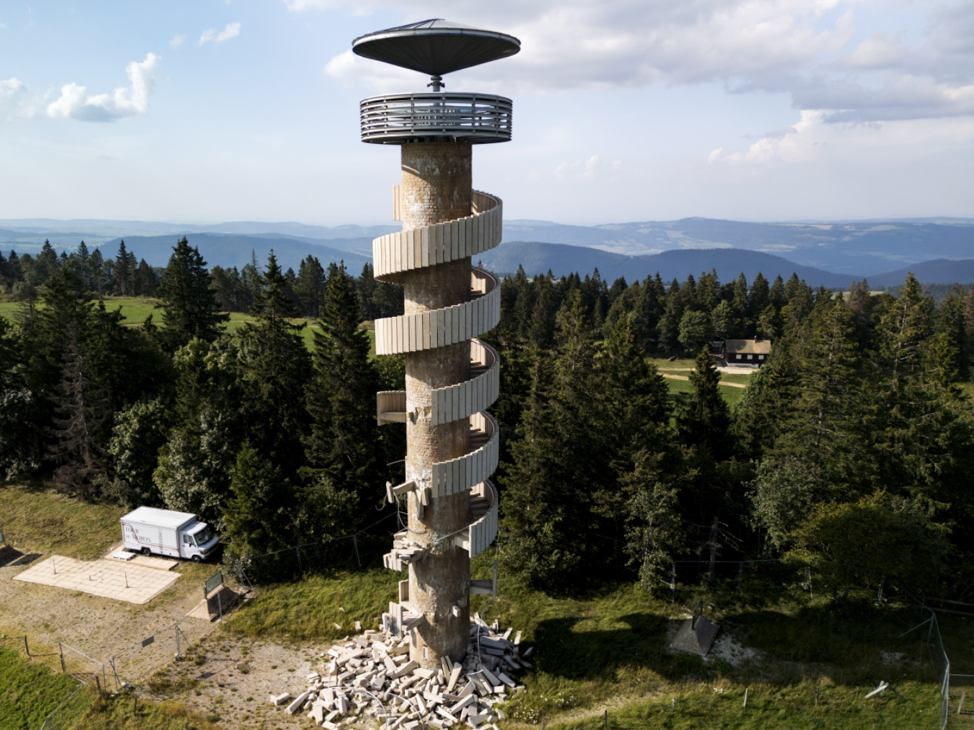 Cette tour a été imaginée il y a plus d’une vingtaine d’années par l’architecte Mario Botta. Des apprentis maçons de toute la Suisse ont participé à la réalisation de cet édifice qui se dresse sur les hauteurs du Jura bernois à plus de 1300 mètres d’altitude.
