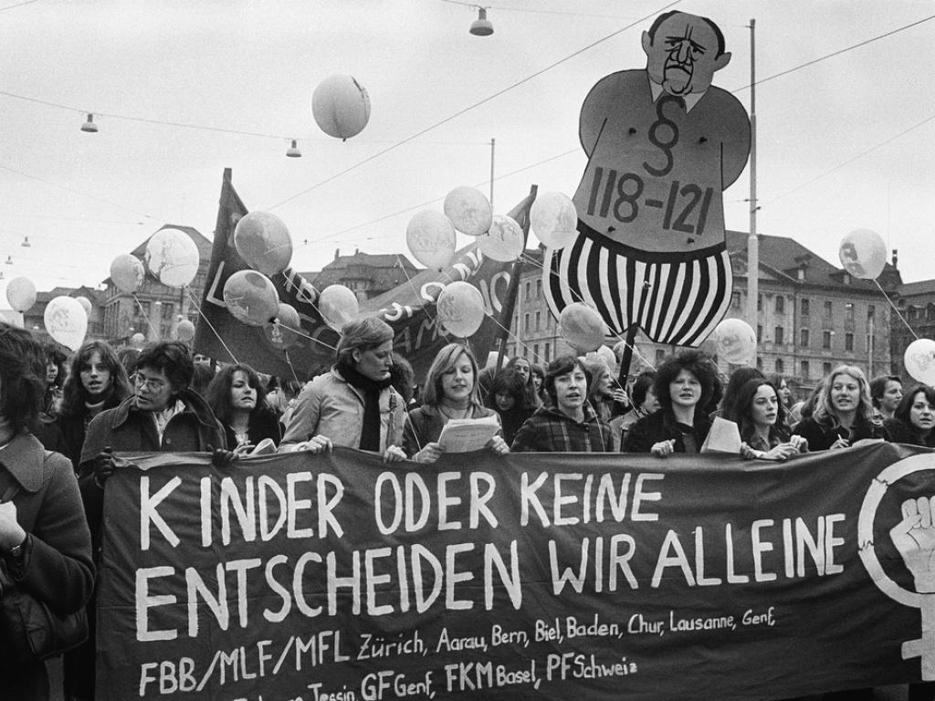 Manifestation nationale en 1975 en faveur de la légalisation de l'avortement. Vingt-sept ans plus tard, la "solution du délai" entre en vigueur. En 2020, un peu moins de 11'000 femmes y ont eu recours (archives). Keystone/PHOTOPRESS-ARCHIV/STR sda-ats