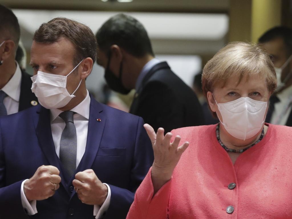 Le plan de relance post-coronavirus de l'UE de 750 milliards d'euros a été inspiré d'une proposition de la chancelière allemande Angela Merkel (à droite) et du président français Emmanuel Macron (à gauche). KEYSTONE/EPA/STEPHANIE LECOCQ / POOL sda-ats