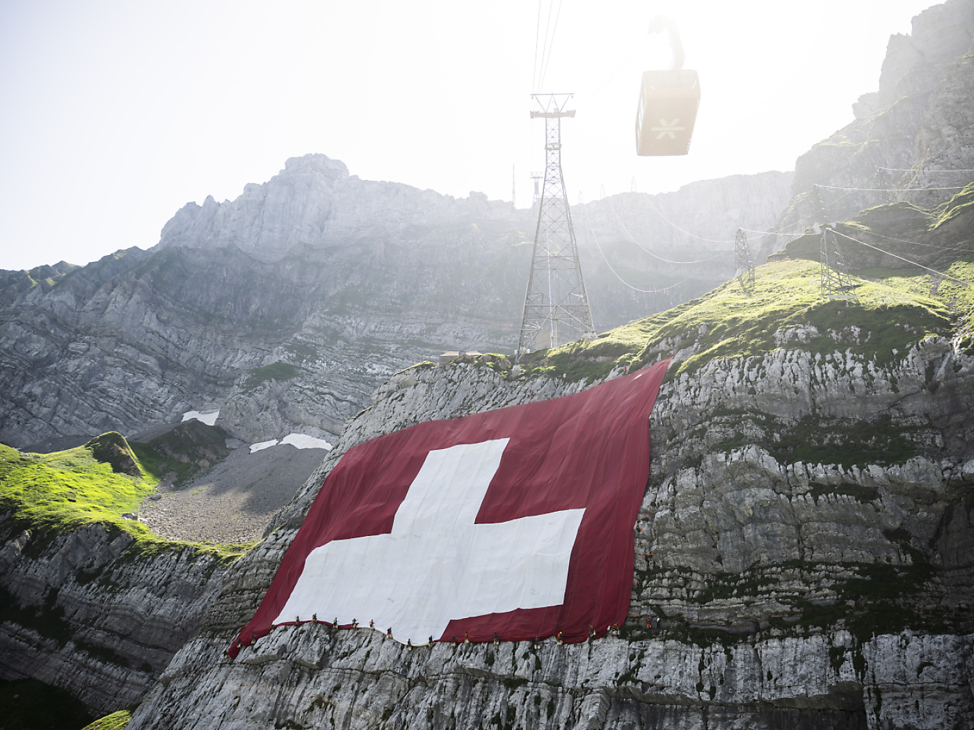 (Keystone-ATS) Le Säntis s’est une nouvelle fois paré de rouge et de blanc en vue de la Fête nationale. D’une taille de 80 m sur 80, un drapeau suisse recouvre la face nord de la montagne appenzelloise depuis mercredi matin. Il s’agit du plus grand du genre au monde.