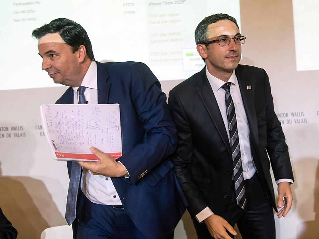 Le président de la ville Sion Philippe Varone (à gauche) et le conseiller d'Etat Frédéric Favre ont dit prendre acte du choix des Valaisans lors d'une conférence de presse dans le chef-lieu valaisan. KEYSTONE/OLIVIER MAIRE sda-ats