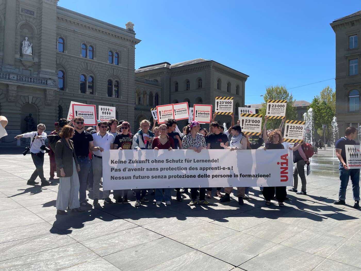 (Keystone-ATS) Une cinquantaine de militants et de sympathisants ont fait entendre sur la place publique à Berne leurs revendications. Des banderoles dénonçaient le fait que près de 23’000 apprentis sont victimes d’accidents chaque année, dont trois en moyenne sont mortels.