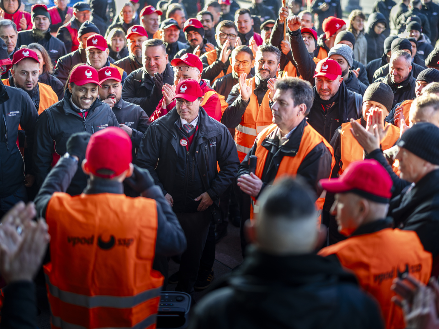 Une bonne douzaine de chauffeurs de bus ont quitté le dépôt mardi matin pour se rendre à la gare en brandissant des drapeaux du SSP, selon les observations d’une journaliste de Keystone-ATS. Ils ont distribué des tracts aux usagers.