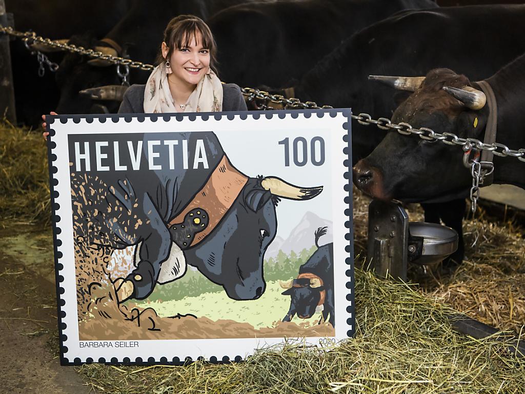 La vache laboure le sol de son sabot, prête à lutter contre son adversaire: le timbre postal spécial présenté jeudi matin lors d’une conférence de presse organisée au domaine de l’école d’agriculture du Valais à Sion lance les festivités du 100e anniversaire de la Fédération suisse d’élevage de la race d’Hérens (FSEH).