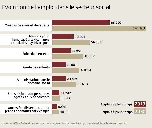 «Le domaine social est devenu un secteur économique important, mobilisant toujours plus de ressources en personnel», peut-on lire dans l’étude. «L’étude confirme que la progression de l’emploi dans le domaine social a été nettement supérieure à la moyenne au cours des dernières années, une tendance qui s’observe aussi à l’étranger. Cette croissance devrait se poursuivre dans les 15 prochaines années.»