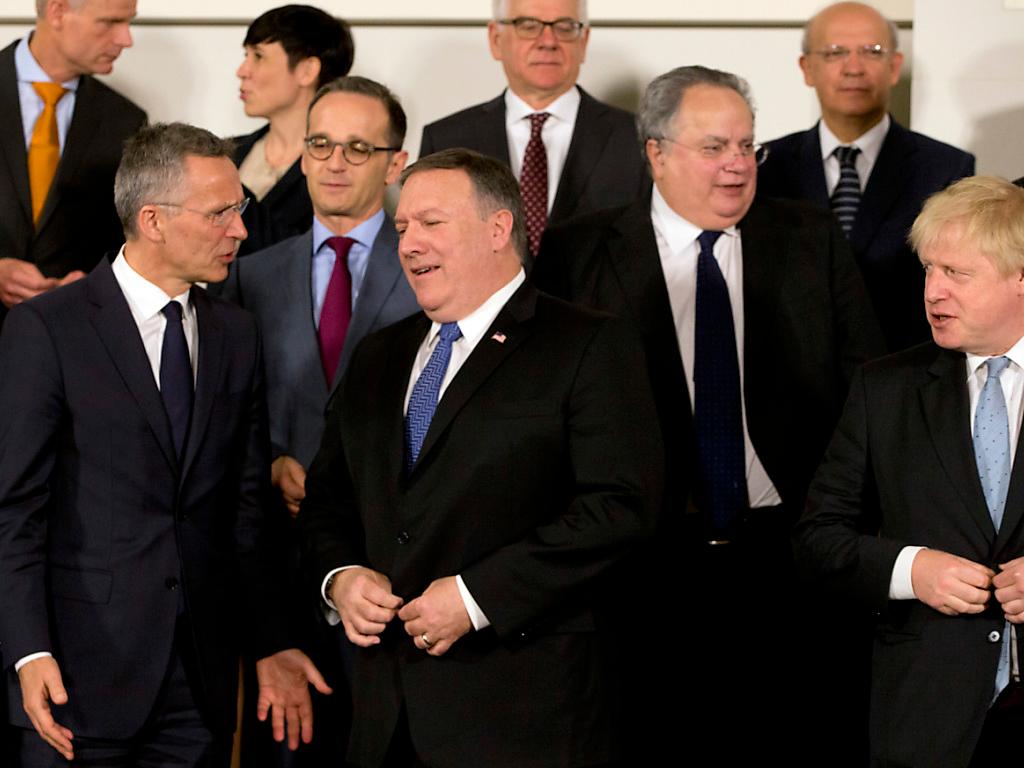 Mike Pompeo (centre) en discussion avec le secrétaire général de l'Otan Jens Stoltenberg, entourés des ministres des affaires étrangères de l'Alliance KEYSTONE/AP/VIRGINIA MAYO sda-ats