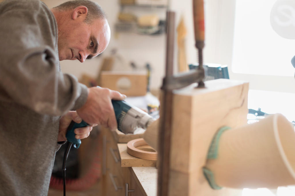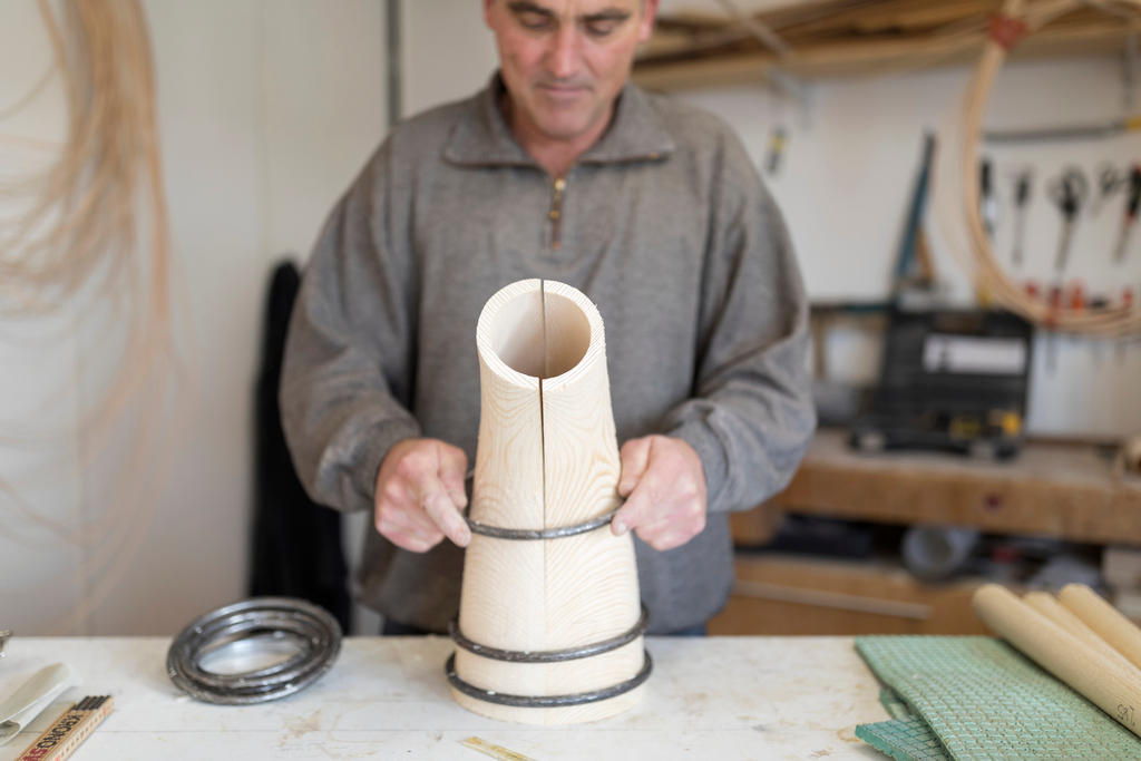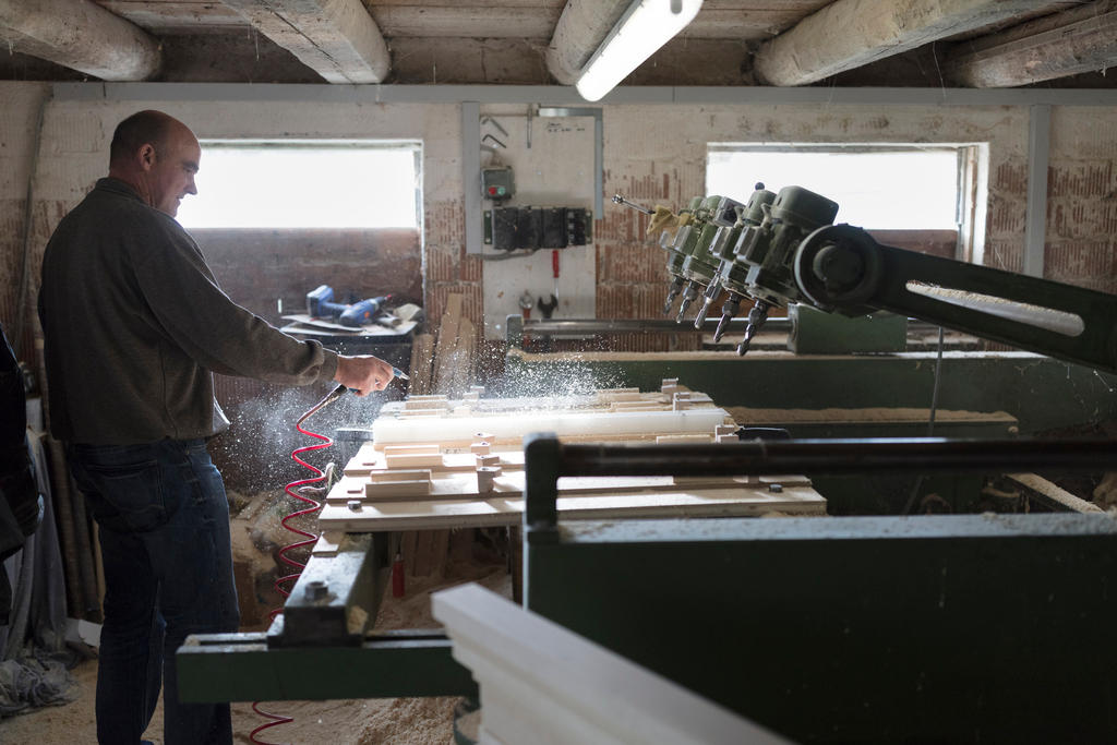 Le photographe Gaëtan BallyLien externe a documenté dans l’atelier de Thomas Eichenberger quelques-unes des 150 étapes nécessaires à la fabrication d’un cor des Alpes. Un travail qui exige près de 60 heures de travail.