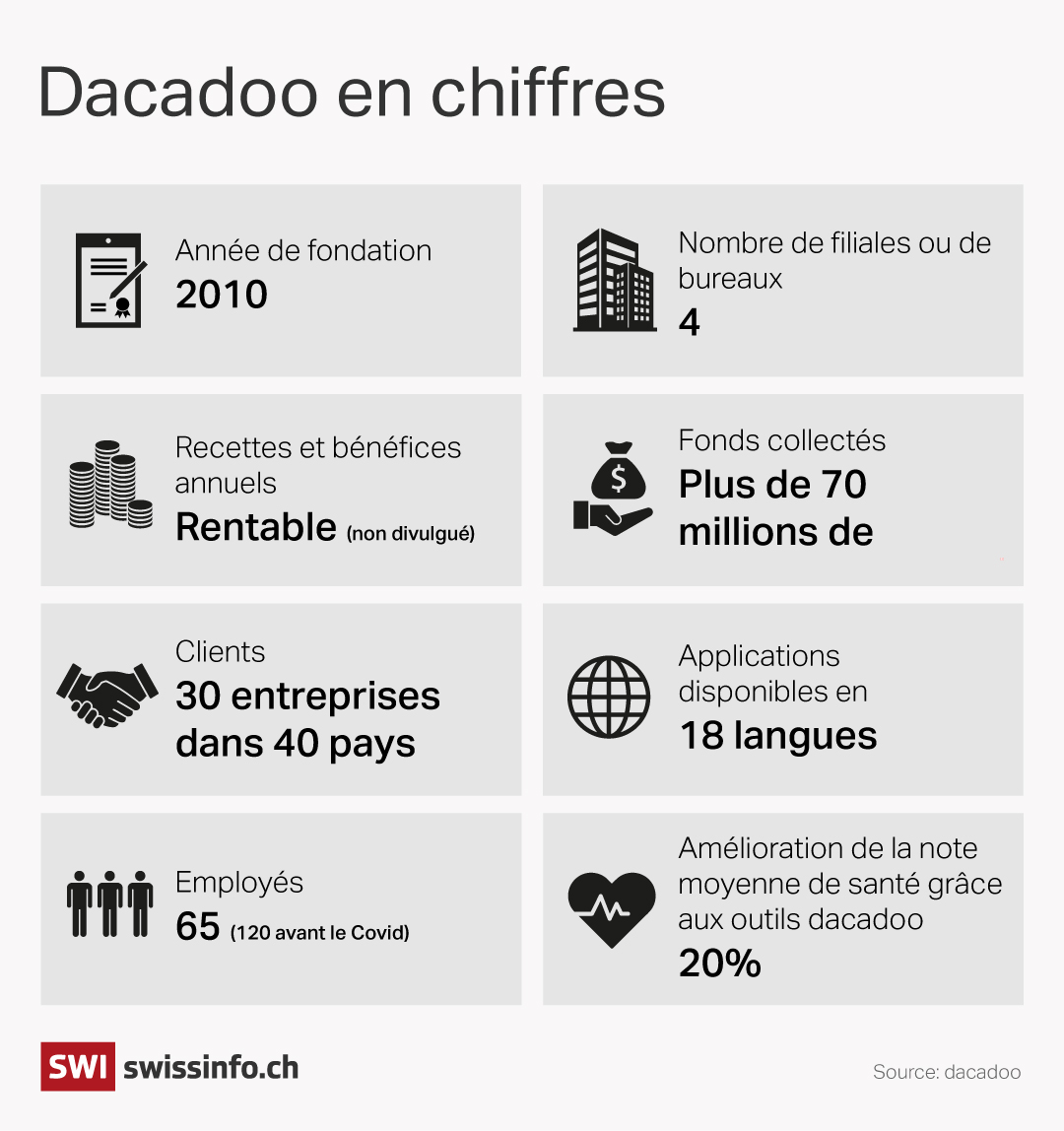 Parmi ces nouvelles entreprises, dacadoo, basée à Zurich, se distingue comme un partenaire international de premier plan. Dans une interview accordée à swissinfo.ch, l’entrepreneur en série Peter Ohnemus, fondateur, président et directeur de dacadoo, évoque les défis importants qu’il doit relever pour concrétiser sa vision d’une meilleure santé publique.