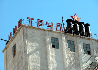 En ruine. Etoile rouge, marteau et faucille sont toujours en évidence au sommet de la tour d'un complexe industriel de l'époque soviétique.