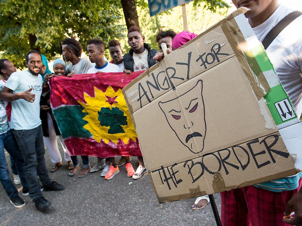 Des migrants manifestaient à Chiasso en septembre dernier contre la difficulté de passer la frontière suisse. KEYSTONE/TI-PRESS/FRANCESCA AGOSTA sda-ats