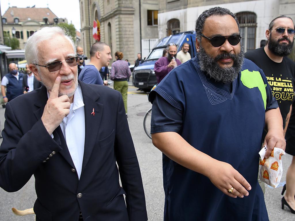 Dieudonné, ici en compagnie de son avocat Pascal Junod, a plaidé son acquittement devant le Tribunal de police de Genève. KEYSTONE/LAURENT GILLIERON sda-ats