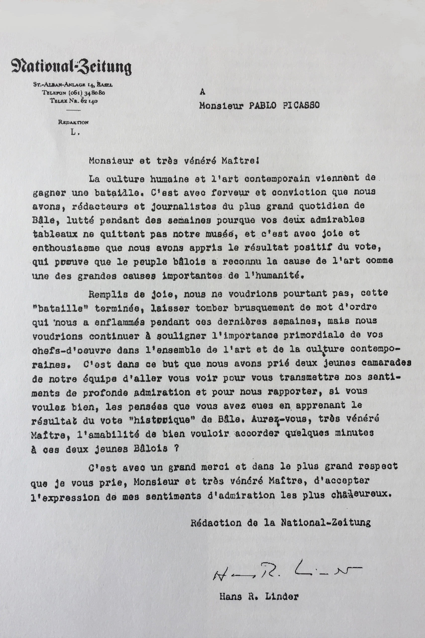 Les jeunes journalistes de la Nationalzeitung également. Kurt Wyss s’en souvient bien: «Dans l’euphorie, nous proposons d’aller faire une interview de Picasso». Le rédacteur culturel secoue la tête. Il y a dix ans que Picasso n’a plus donné d’interview. Kurt Wyss et son collègue Bernhard Scherz s’envolent malgré tout le jour même pour le sud de la France où l’artiste espagnol vit depuis des années. Ils emportent avec eux des documents sur ce qui vient de se passer dans leur ville et une lettre de recommandation enflammée.
