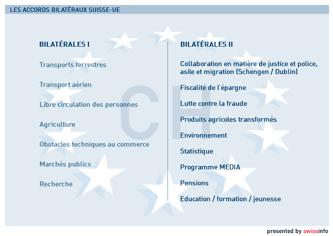 Les accords bilatéraux I, entrés en vigueur en 2002, concernent la libre circulation des personnes, les mises au concours pour les marchés publics, l’agriculture, la recherche, les transports terrestre et aérien.