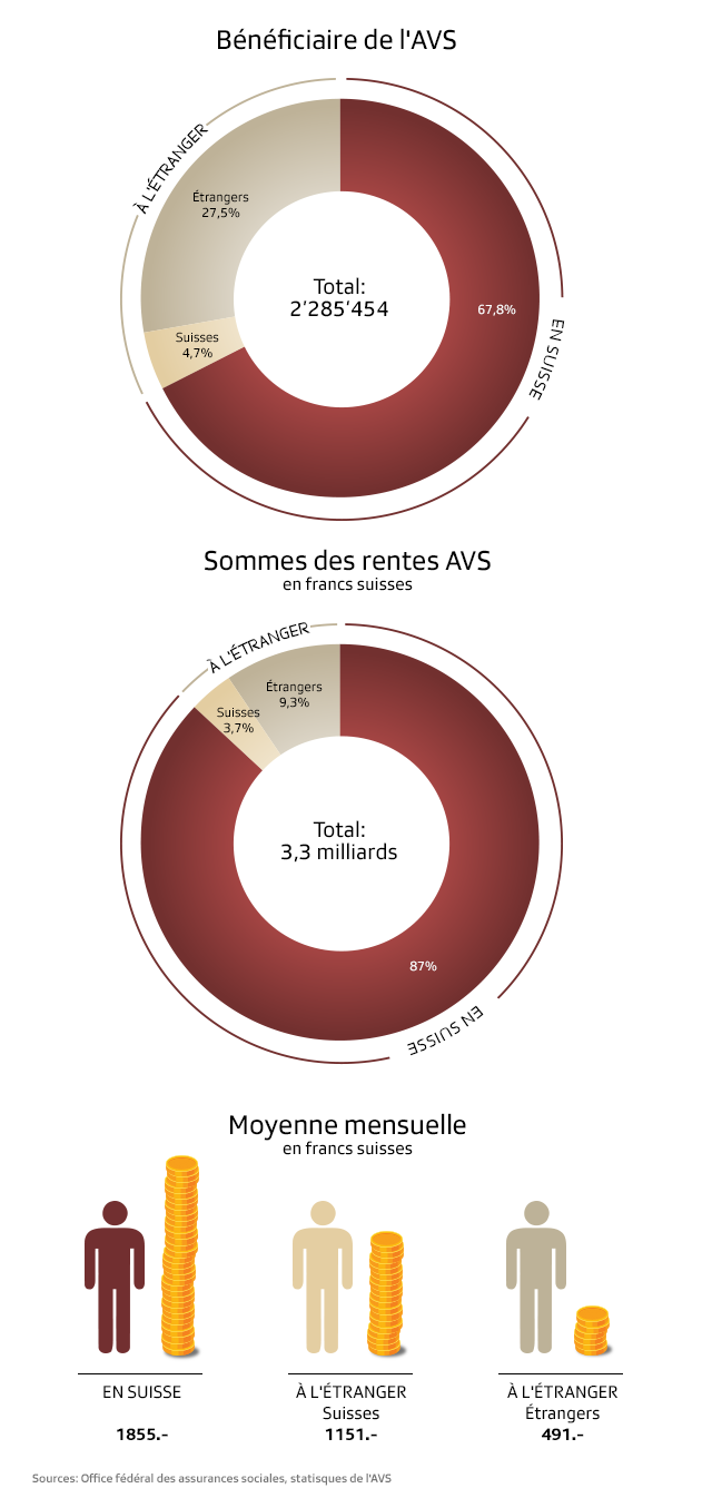 Sur un total de près de 2,2 millions de bénéficiaires de l’assurance vieillesse et survivants (AVS), 721’000 – parmi lesquels 104’000 Suisses et près de 617’000 étrangers – résidaient à l’étranger. Cela correspond à près d’un tiers du total des rentiers de l’AVS.