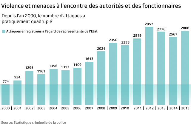 Cette flambée de violence s’inscrit dans le contexte d’une hausse croissante des attaques contre les forces de l’ordre répertoriées sur l’ensemble de la Suisse depuis l’an 2000: