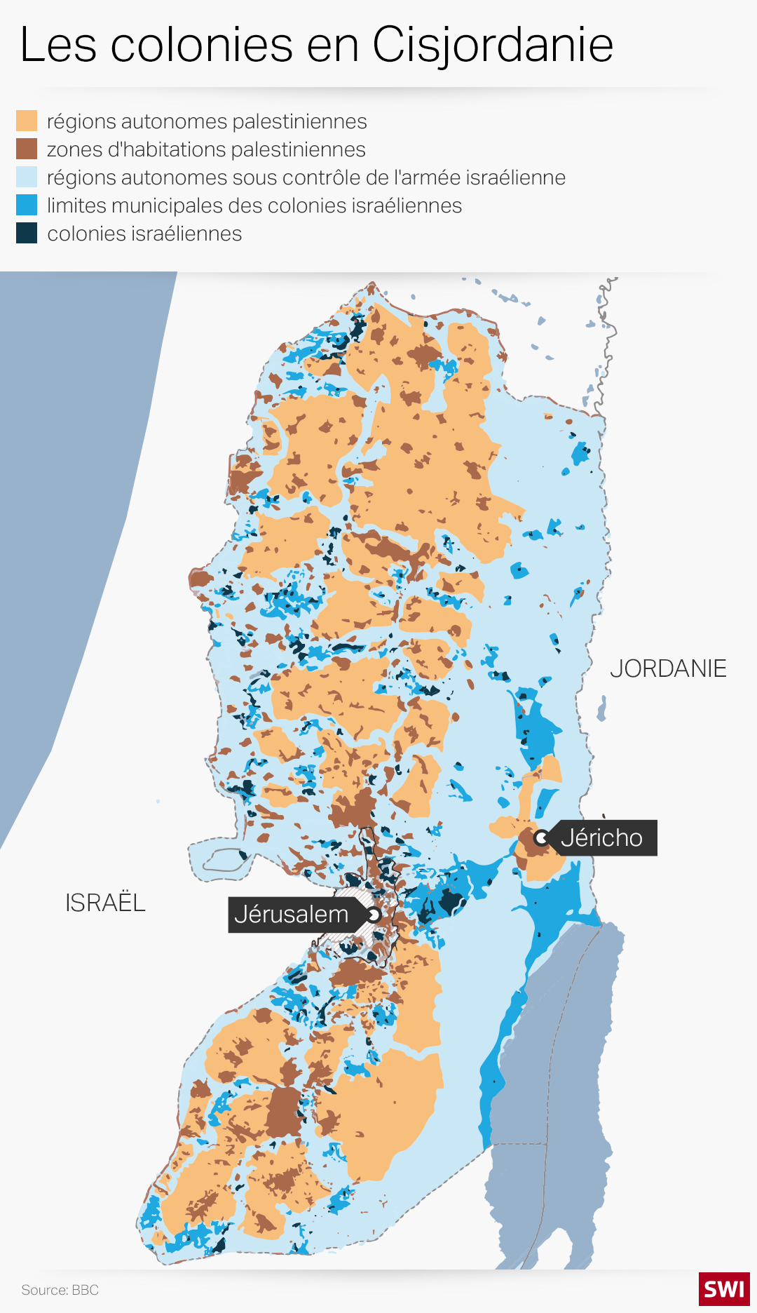 Comme l’ONU et l’Union européenne, la Suisse soutient officiellementLien externe la solution à deux États pour résoudre le conflit israélo-palestinien. Toutefois, en raison des colonies juives en Cisjordanie, cela n’est guère possible d’un point de vue territorial.