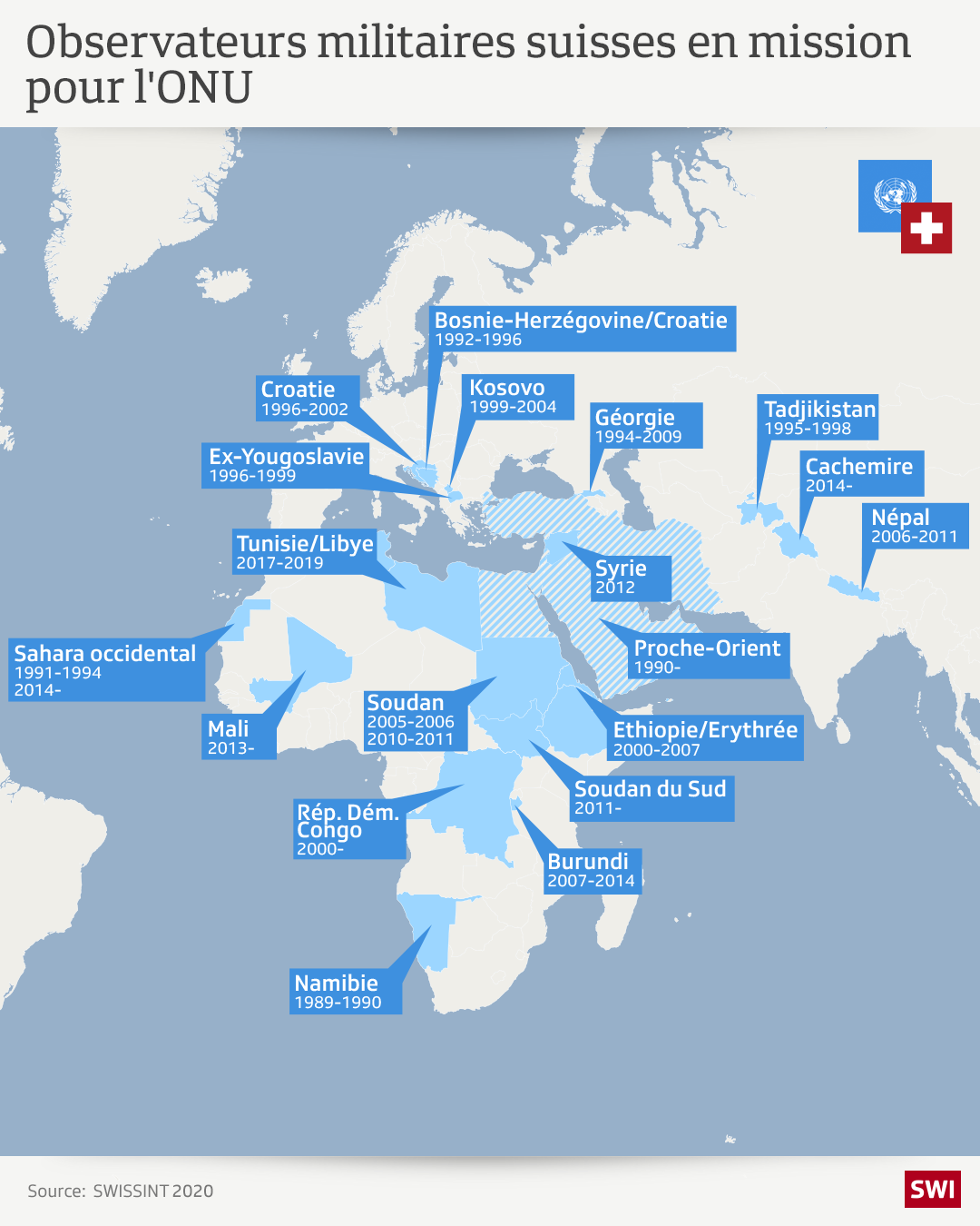 Les membres de l’armée suisse ont jusqu’à présent été déployés dans 19 missions de maintien de la paix de l’ONU (en plus du siège principal de l’ONU à New York depuis 2011). Six missions sont encore en cours.