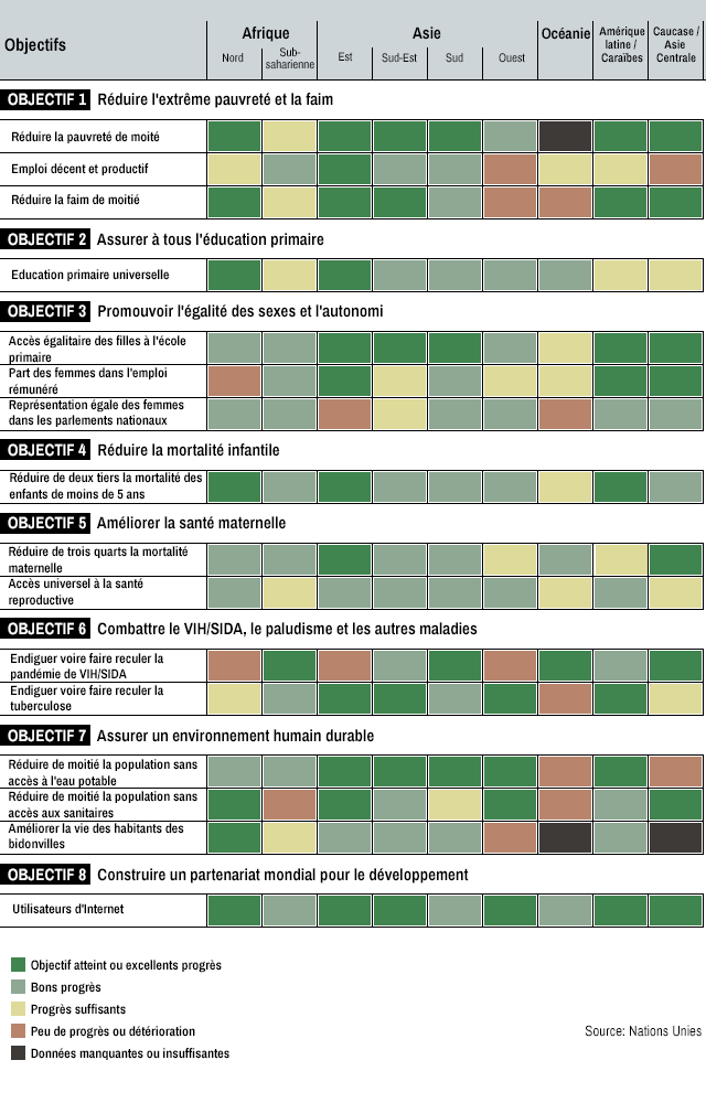 Ce tableau des Nations Unies présente les progrès réalisés dans différentes régions du monde par rapport aux huit ODM. Les tendances et les données se basent sur les informations qui étaient disponibles en juin 2015.