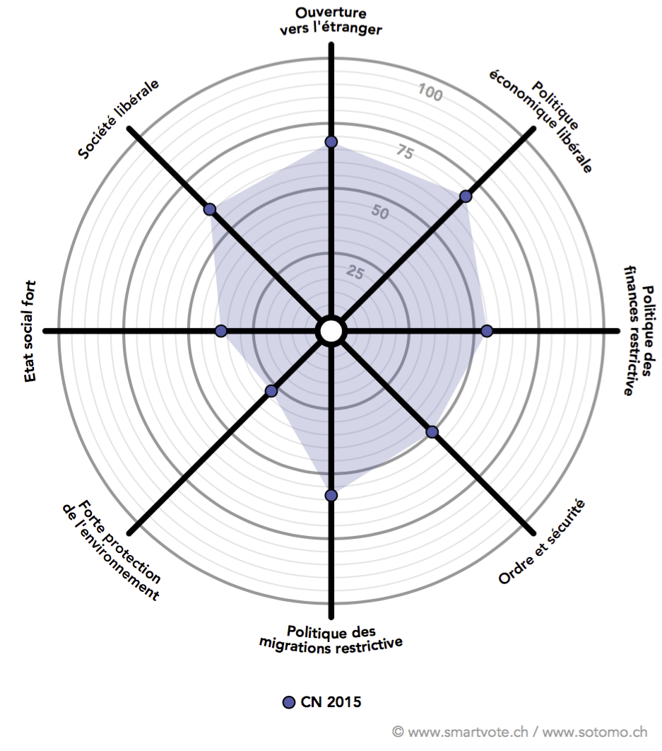 Profil de la nouvelle Chambre basse (Conseil national). Manquent sur ce graphique les données de 11 députés UDC et d’un PLR. L’image réelle est donc encore plus conservatrice. swissinfo.ch