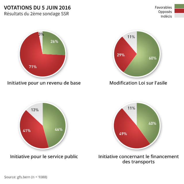 Le 2e sondage réalisé par l’institut de recherche gfs.bern pour le compte de la SSR montre que le sort de l’initiative «Pro Service Public» reste incertain. En revanche, les initiatives «Pour un revenu de base inconditionnel» et «Pour un financement équitable des transports» devraient être refusées. Quant à la révision de la Loi sur l’asile, elle devrait passer la rampe.