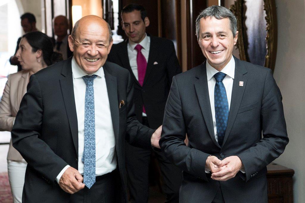 Après leur première rencontre à Paris fin 2017, Ignazio Cassis et Jean-Yves Le Drian se sont à nouveau rencontrés vendredi pour un déjeuner de travail à Berne. «Les deux ministres ont souligné l’importance, depuis plusieurs années, de la très bonne relation entre la France et la Suisse qui couvre des domaines variés et se caractérise par des contacts réguliers à différents niveaux», a indiqué le Département fédéral des affaires étrangères dans un communiquéLien externe diffusé à l’issue de la réunion.