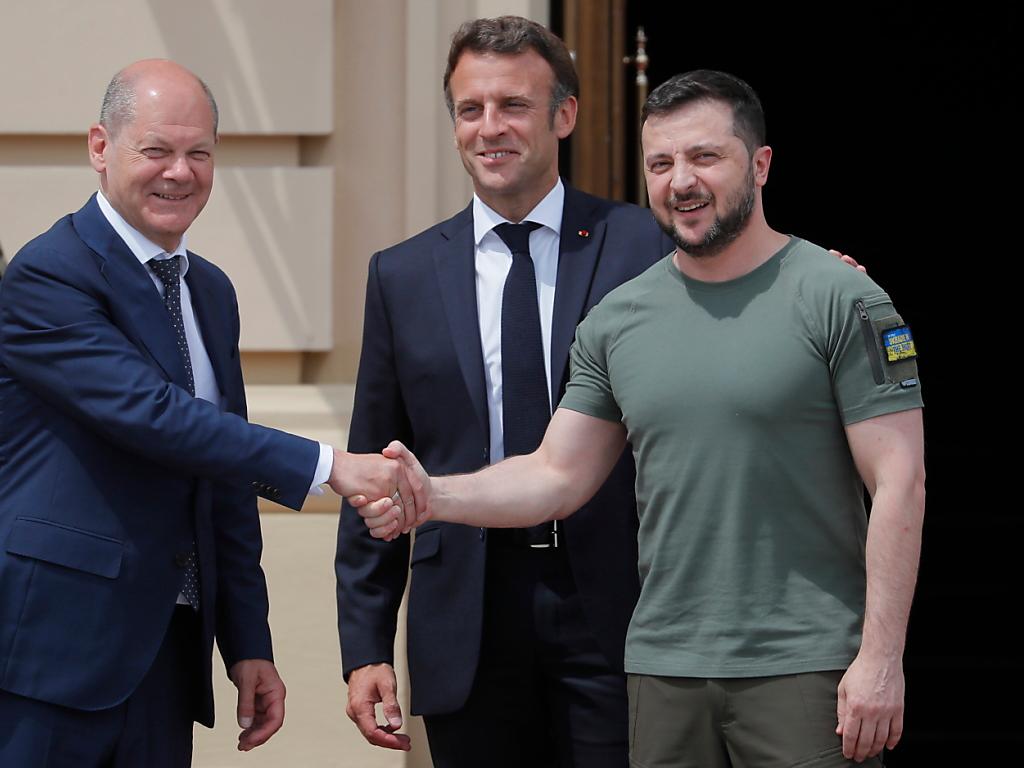 Les trois hommes (de g. à dr Olaf Scholz, Emmanuel Macron et Volodymyr Zelensky) vont se retrouver mercredi pour un dîner à Paris KEYSTONE/EPA/SERGEY DOLZHENKO sda-ats