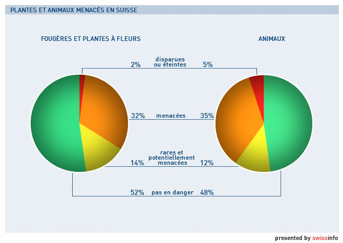 Sur les 10’341 espèces menacées et énumérées sur des listes rouges, 236 avaient disparu en Suisse en 1990. Petite consolation: le mouvement de pertes d’espèces et de surfaces pour certains écosystèmes à un peu ralenti par rapport aux 20 dernières années