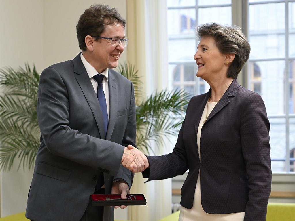 (Keystone-ATS) Simonetta Sommaruga a remis vendredi les clefs du dicastère de l’Energie à son successeur. Albert Rösti prendra ses fonctions officiellement le 1er janvier.