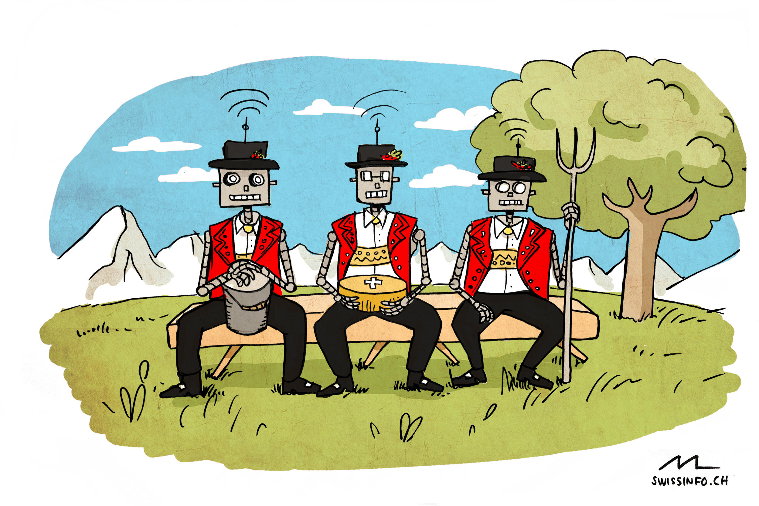 Marina Lutz a rejoint swissinfo.ch voici un an pour produire la série «Le dessin Lien externede la semaine», un rebond sur l’actualité helvétique. Sa dernière caricature est parue le 10 mars. La dessinatrice de 28 ans vient de la région romanche du canton des Grisons. Elle a été invitée à transformer les faits saillants de l’année en caricatures compréhensibles par un public peu au fait des réalités du pays.