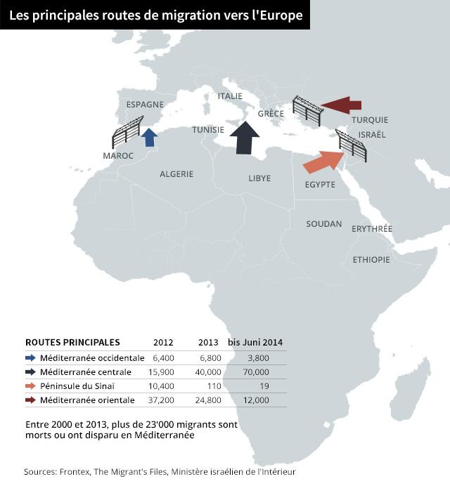 Depuis qu’Israël a construit un mur de 230 kilomètres à sa frontière avec l’Egypte, ainsi rendue pratiquement imperméable, la route de la Méditerranée est la plus utilisée par les Erythréens. Le nombre de personnes débarquant sur les côtes italiennes a augmenté de manière considérable, également en raison du chaos qui règne en Libye et de l’opération Mare NostrumLien externe, lancée en octobre 2013 par l’Italie pour secourir les migrants en mer.