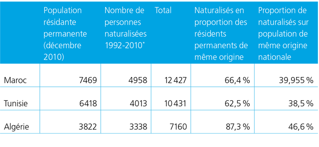 Concernant la naturalisation, en quelques années, le nombre d’immigrés des trois pays du Maghreb ayant obtenu la nationalité suisse a augmenté. Entre 1992 et 2010, quelque 200 à 280 Tunisiens ont été naturalisés chaque année, alors que ce nombre se situe entre 150 et 200 pour les Algériens. Le tableau ci-dessous illustre le processus de naturalisation entre 1992 et 2010.