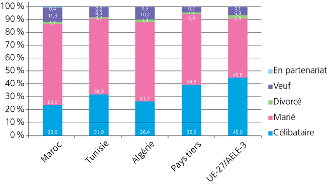 La plupart des ressortissants des trois pays du Maghreb sont mariés (deux tiers pour les Algériens et les Marocains contre 59% pour les Tunisiens). Ce qui signifie que la majorité de ces immigrés vit de façon stable au sein d’une famille. La proportion de célibataires est de 24% chez les Marocains et de 32% chez les Tunisiens.