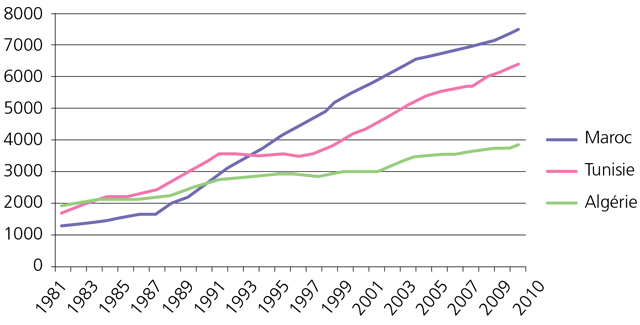 A la fin de l’année 2010, la Suisse comptait un peu plus de 18’000 personnes originaires du Maghreb (Maroc: 7469, Tunisie: 6418, Algérie: 3822). Résidents permanents, ces immigrés habitent notamment dans les grandes villes et les cantons francophones. Le tableau ci-dessous illustre l’évolution, entre 1981 et 2010, du nombre des résidents permanents maghrébins en Suisse, recensés selon leur pays d’origine.