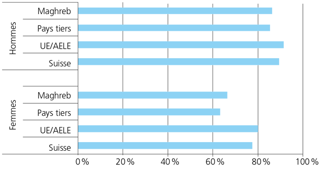 Enfin, la proportion d’hommes maghrébins actifs sur le marché du travail en Suisse est plus élevée que celle des autres étrangers des pays hors UE / AELE.